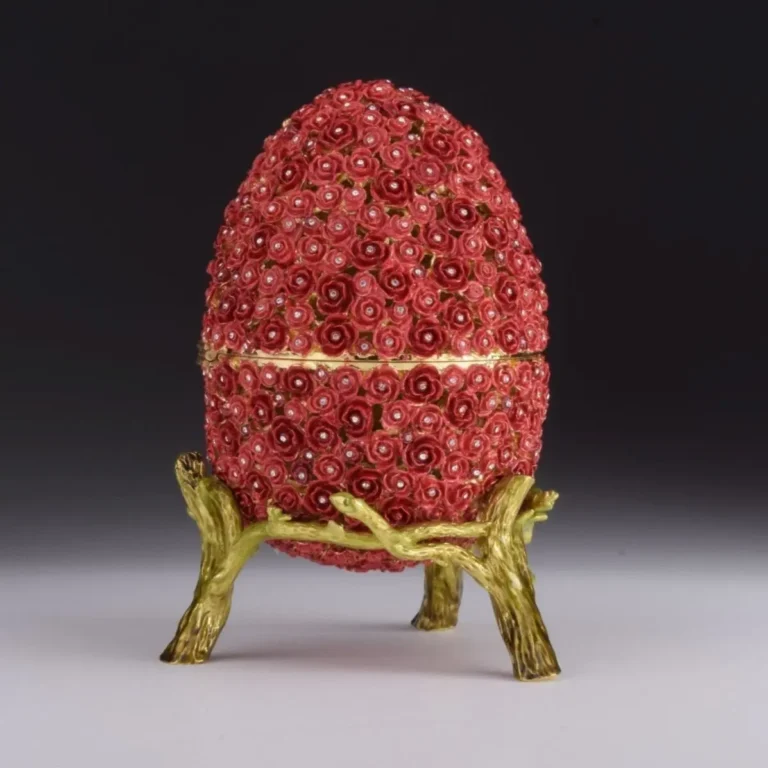 Exquisite Red Flowers Faberge Egg – Handcrafted Trinket Box with Austrian Crystals & Gold Plating