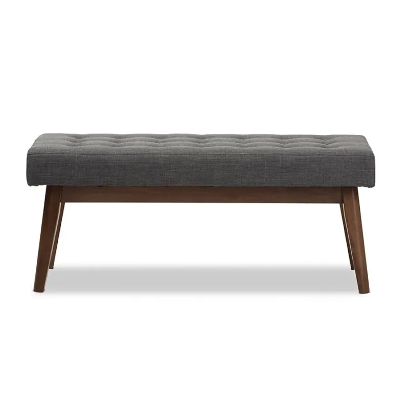 Elia Mid-Century Modern Bench – Elegant Walnut Wood & Dark Grey Button-Tufted Fabric Upholstery