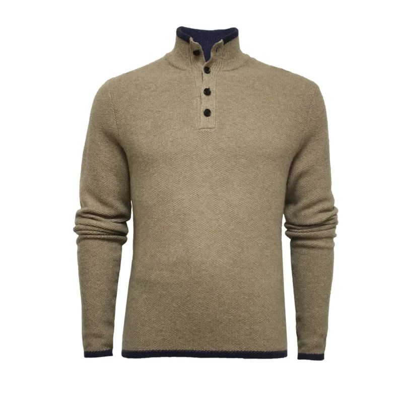 Luxurious Camel Cashmere Sweater with Button Neck Kandui in Small Seed Stitch | Premium Comfort & Style