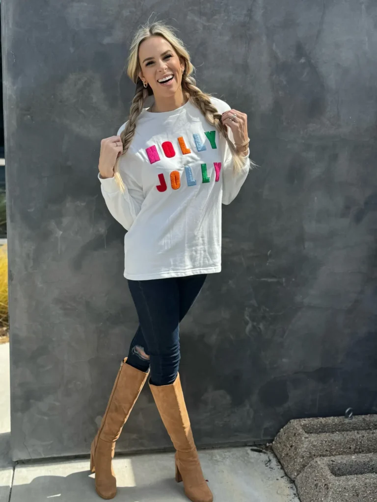 Holly Jolly Christmas Sweatshirt – Cozy Chenille, Festive Graphic, Round Neck, Long Sleeves | Perfect for Holiday Cheer