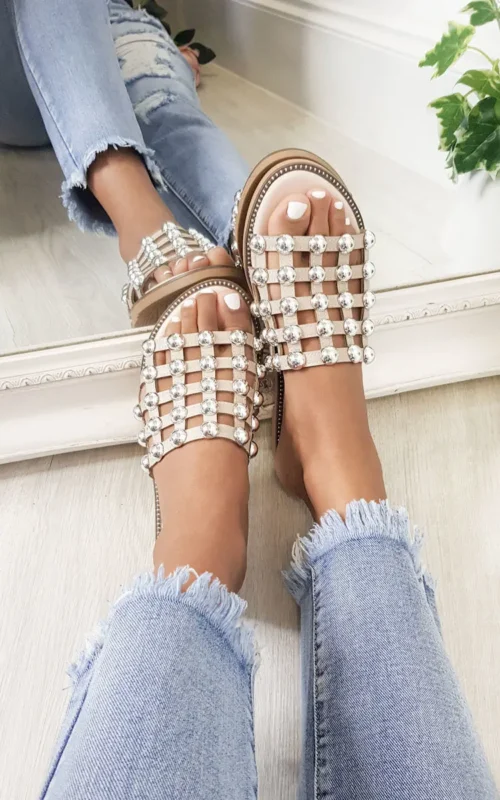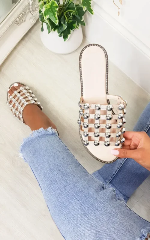 Studded Caged Open Toe Sliders – Chic & Comfortable Summer Sandals