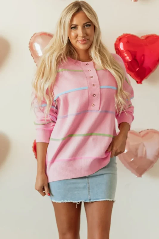 Miriam Stripes Baggy Henley Sweater – Rainbow Stripes, Relaxed Fit & Casual Style