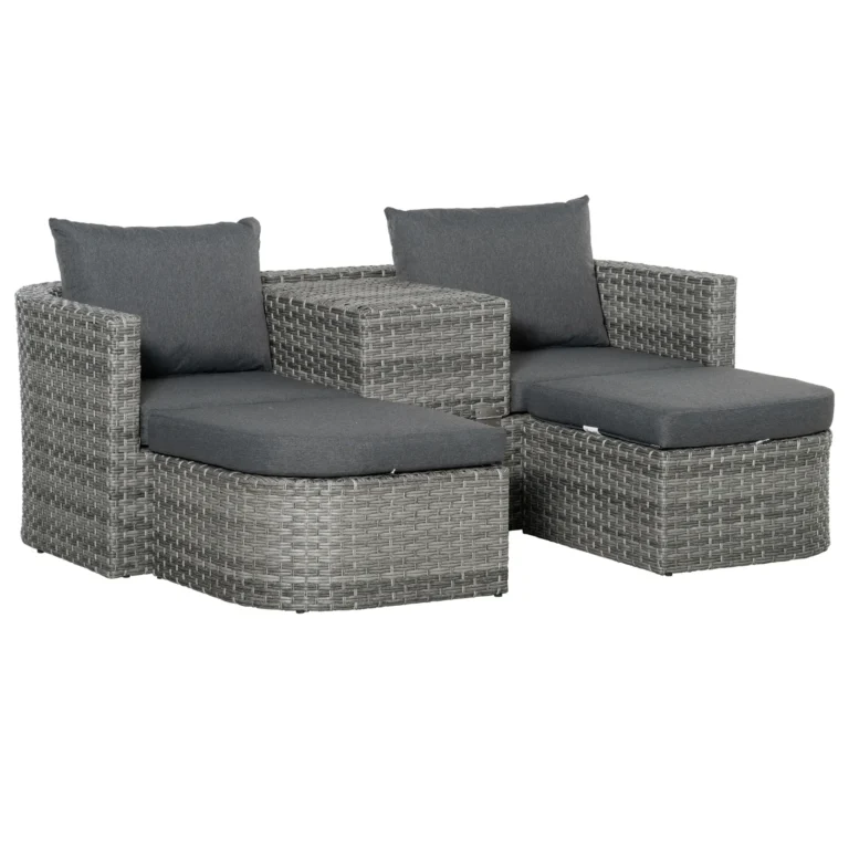 Outsunny 3-Piece Outdoor PE Rattan Sofa Set – Patio Wicker Double Chaise Lounge with Table – Large Grey Daybed with Cushions