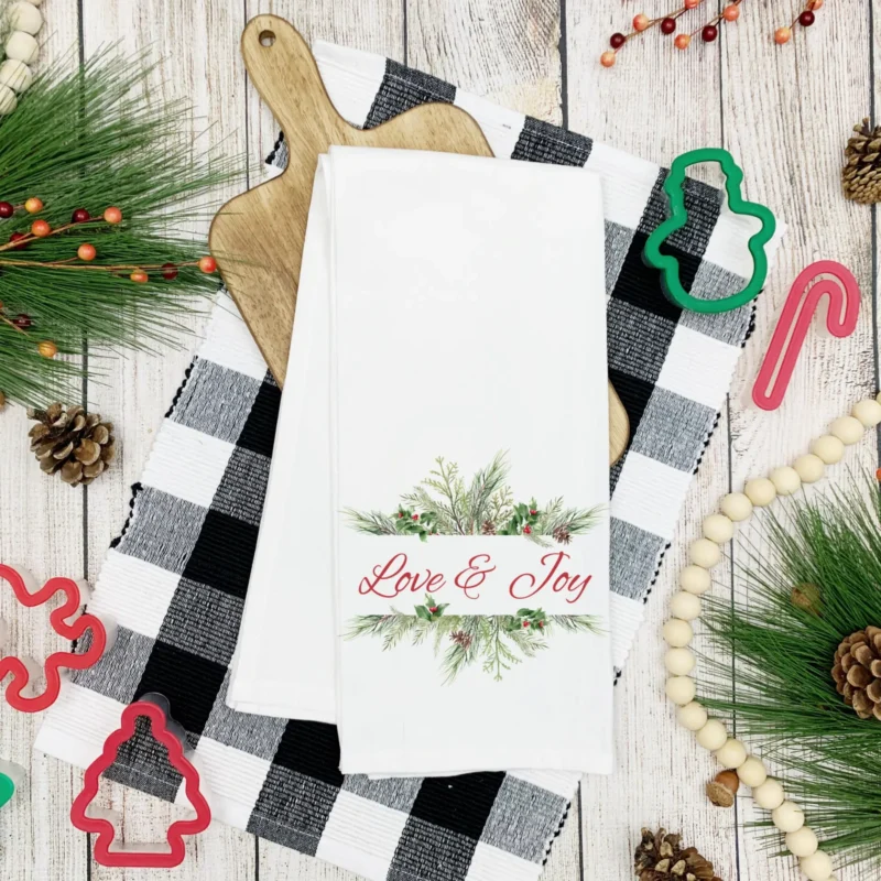 Christmas Farmhouse Love & Joy Tea Towel – Festive Kitchen Hand Towel for Airbnb & Holiday Gifts