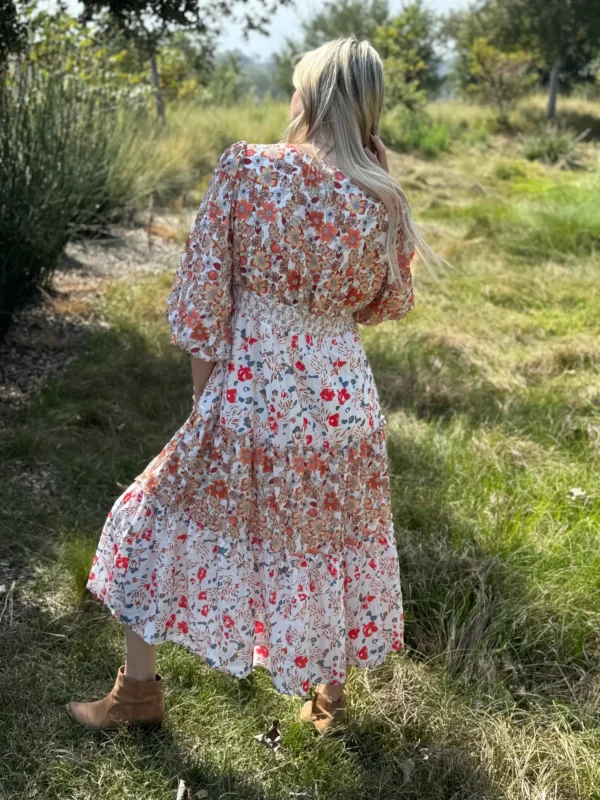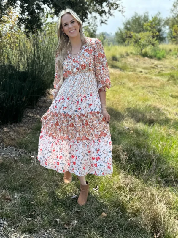 Lily Floral Ruffled Tiered Midi Dress – Elegant V-Neck, High Waisted, Long Sleeve Mid-Length Dress – Perfect for Any Occasion