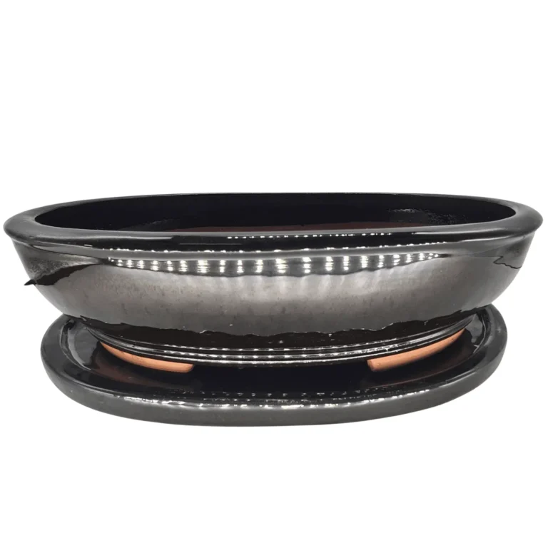37cm Oval Glazed Bonsai Pot with Black Finish and Drip Tray | Perfect for Bonsai Enthusiasts