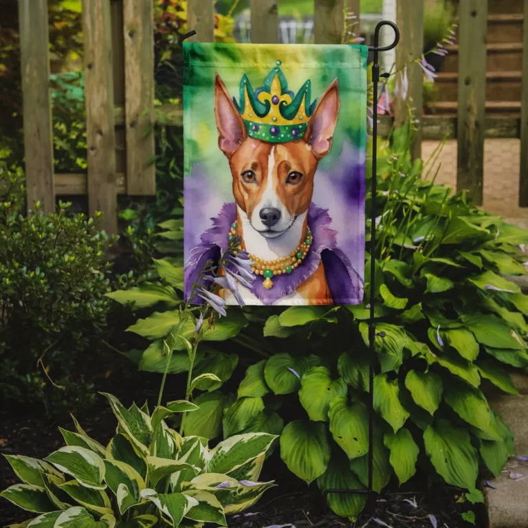 Basenji King of Mardi Gras Garden Flag – Double-Sided, Weather-Resistant Decorative Flag for Yard & Patio – Made in USA