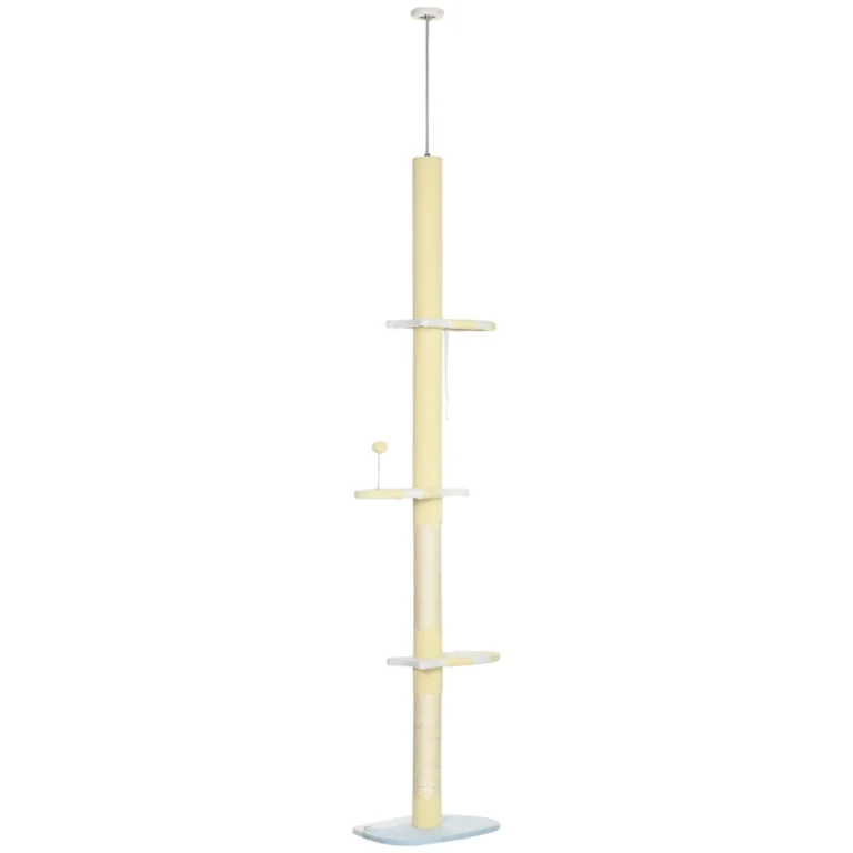 PawHut 260cm Floor to Ceiling Cat Tree – Adjustable Kitten Tower with Anti-Slip Kit, Multi-Layer Activity Centre, Fish-shaped Perches, Scratching Post Ball Toy – Yellow