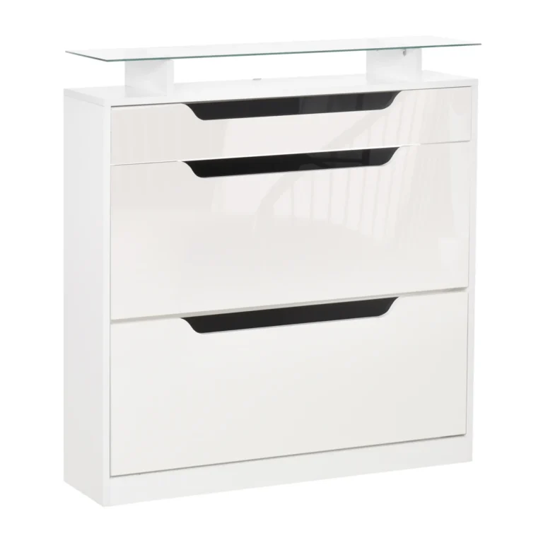 HOMCOM High Gloss White Shoe Cabinet with 3 Drawers, Adjustable Shelves, and Glass Top – Large Capacity for 14 Pairs