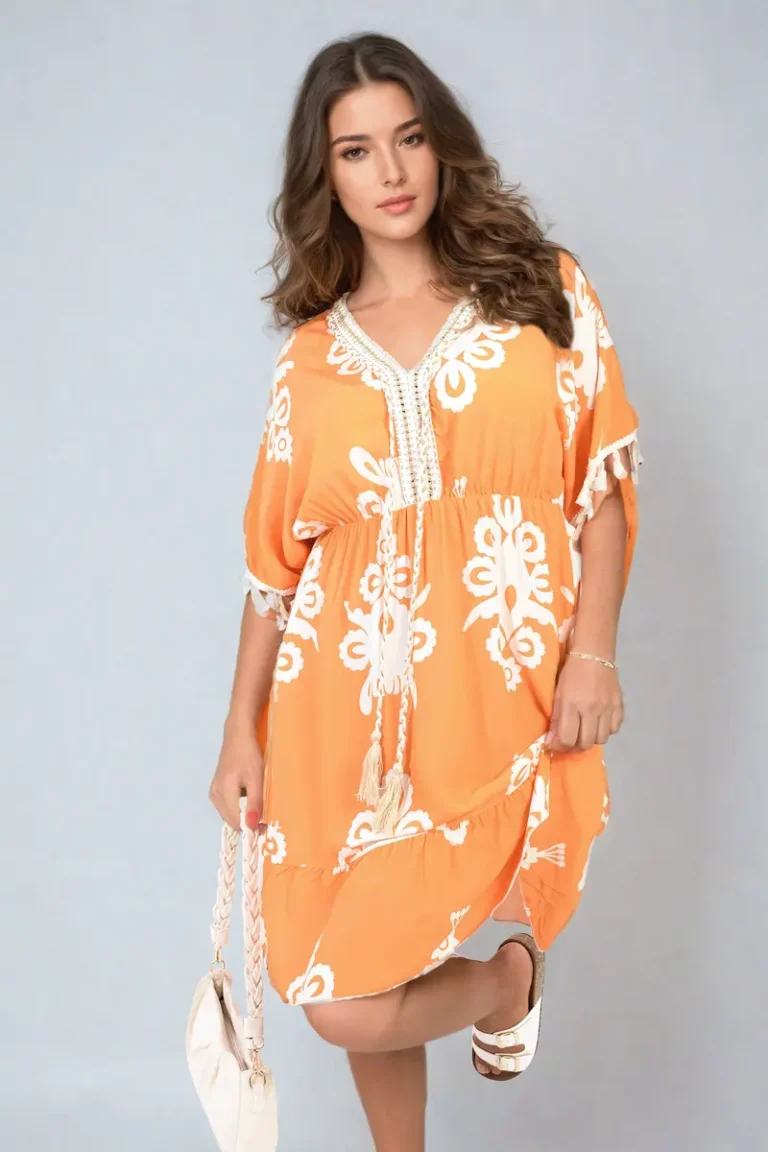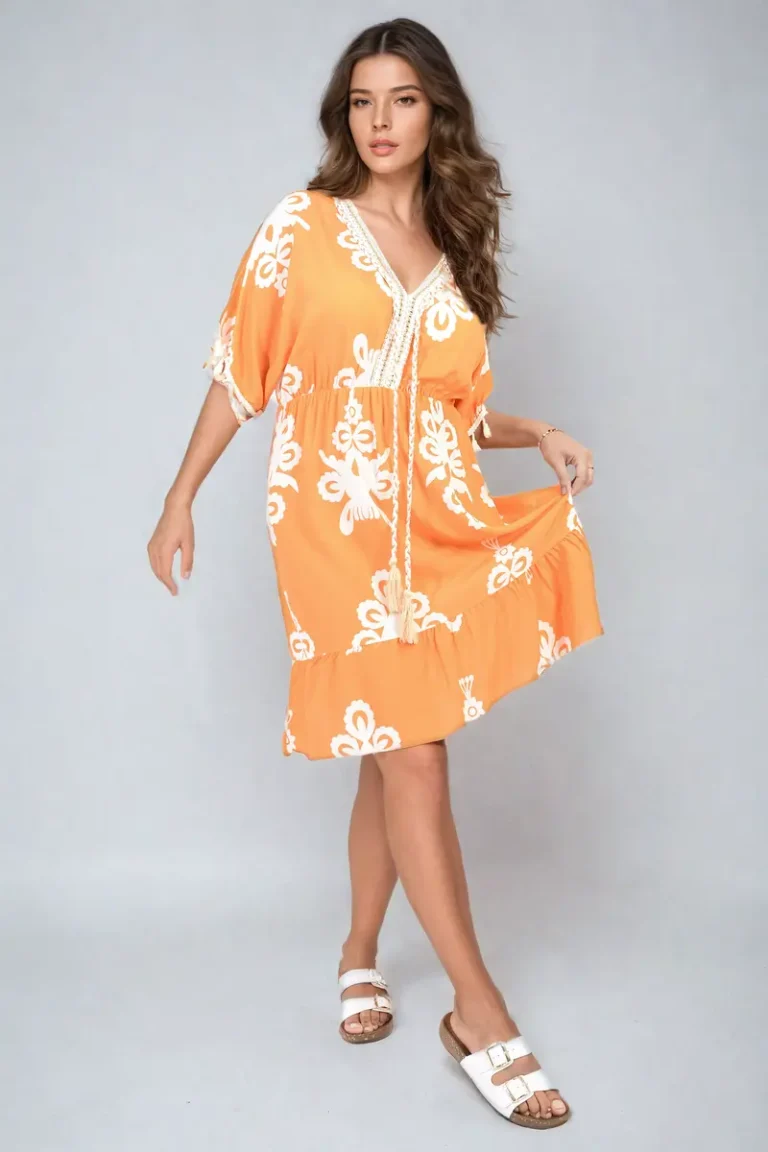 Chic Bohemian Printed V-Neck Short Sleeve Midi Dress with Tassel Detail – Perfect for Any Occasion