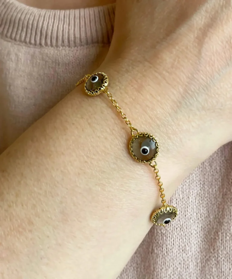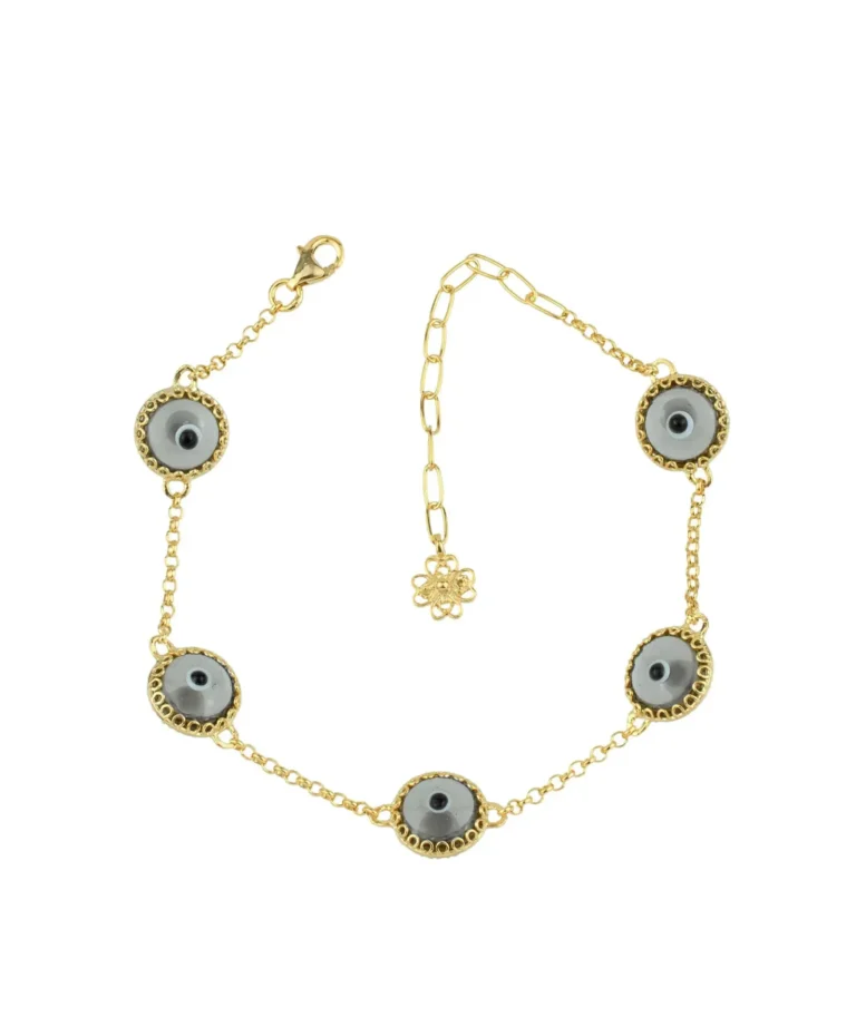 5 Beads Smokey Evil Eye Gold Plated Silver Link Bracelet – Stylish & Protective Women’s Jewelry