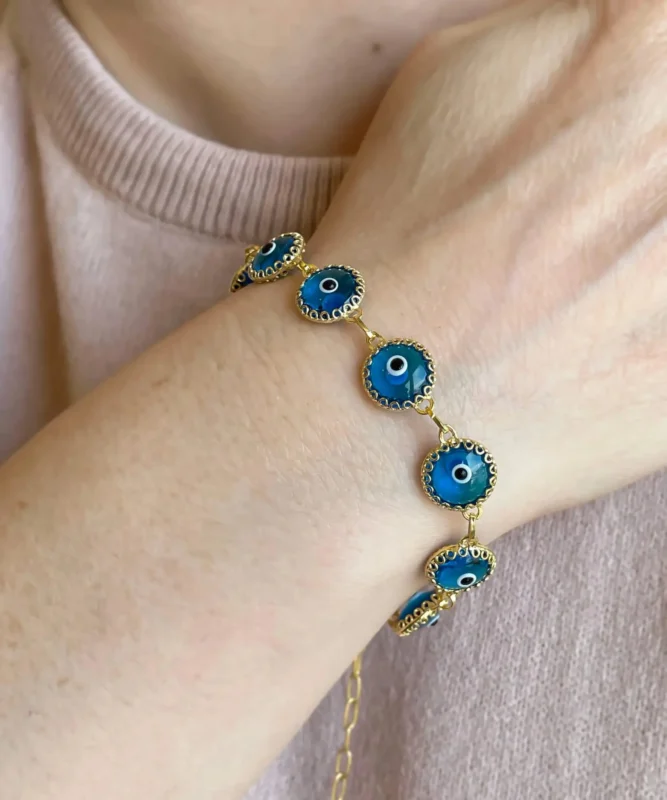 USDC20.88 – USDC31.3310 Beads Lapis Blue Evil Eye Womens Gold Plated Silver Link Bracelet Elegant Protection Jewelry