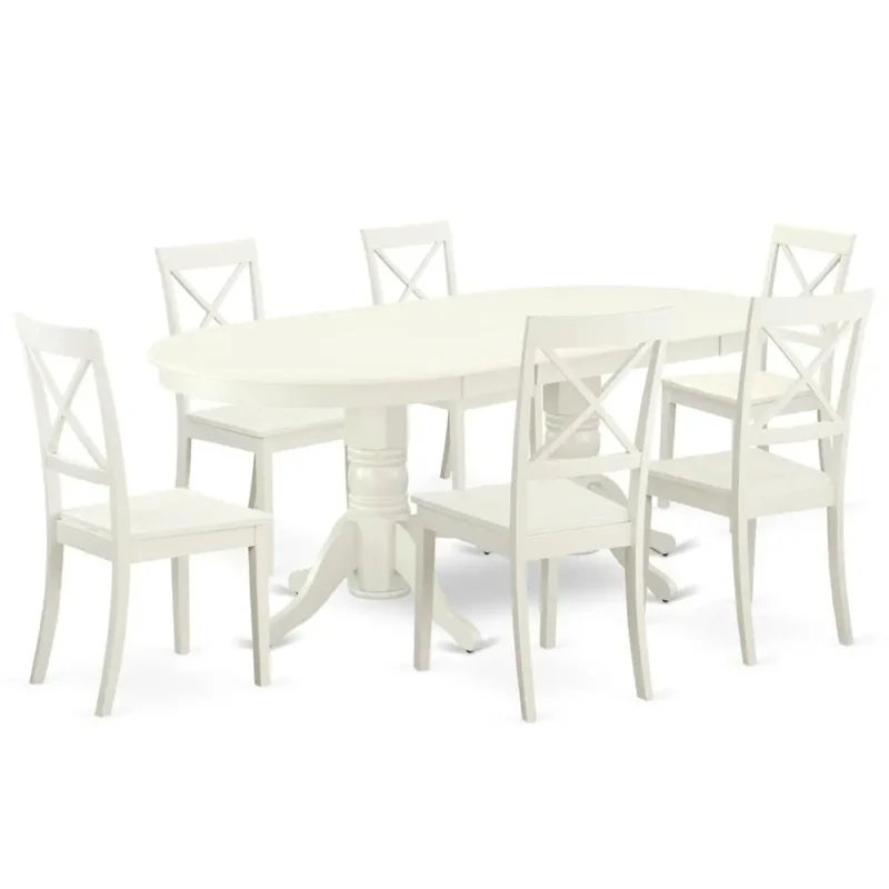 Elegant Linen White 7-Piece Dining Room Set – Oval Table with Self-Storage Butterfly Leaf & 6 X-Back Chairs