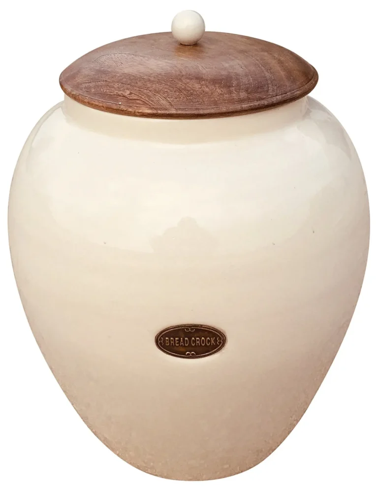 Large Cream Ceramic Bread Bin with Glazed Design and Solid Wood Lid Perfect Kitchen Storage & Organization