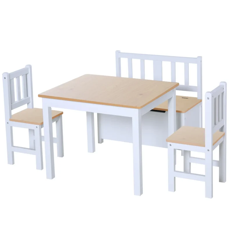 HOMCOM 4-Piece Kids Table and Chair Set – Modern Design with Storage Bench, Natural/White
