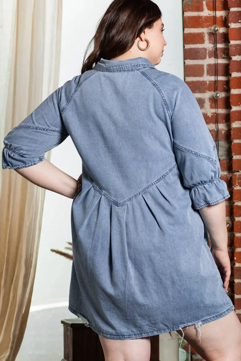Adley Ruffled 3/4 Sleeve Buttoned Front Plus Size Denim Dress – Trendy & Elegant Women’s Fashion