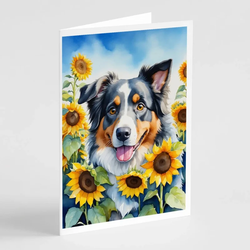 Australian Shepherd in Sunflowers Greeting Cards – Pack of 8 | High-Quality 5×7 Blank Cards with Envelopes | Perfect for All Occasions