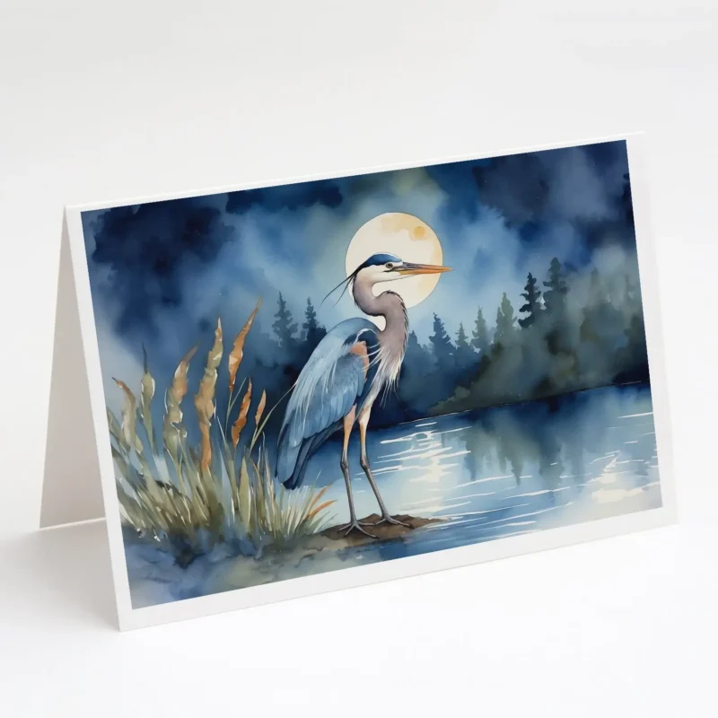 Blue Heron Under the Moonlight Greeting Cards – Pack of 8 | Stunning Artwork | Blank Interior for Personalized Messages | High-Quality 80 lb Cover Stock