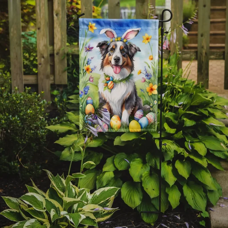 Australian Shepherd Easter Egg Hunt Garden Flag – Vibrant, Weatherproof, 2-Ply Fabric – Celebrate Easter in Style!
