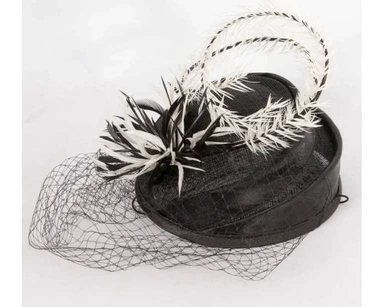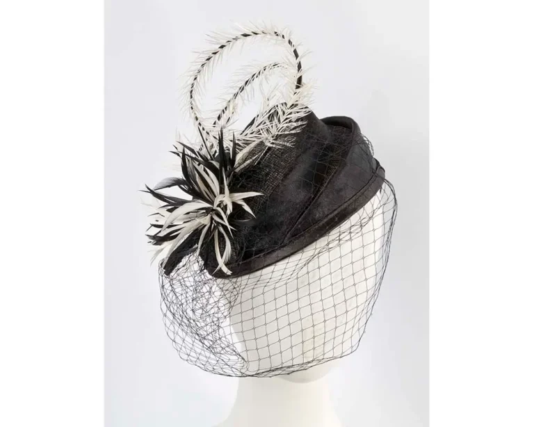 Elegant Black and Cream Pillbox Fascinator with Face Veil – Perfect for Weddings & Special Occasions