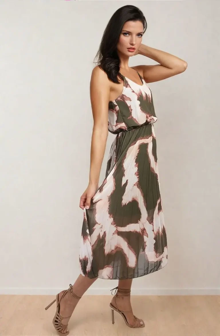 Stylish Printed Strappy Pleated Midi Dress – Elegant & Flowy Design for Any Occasion