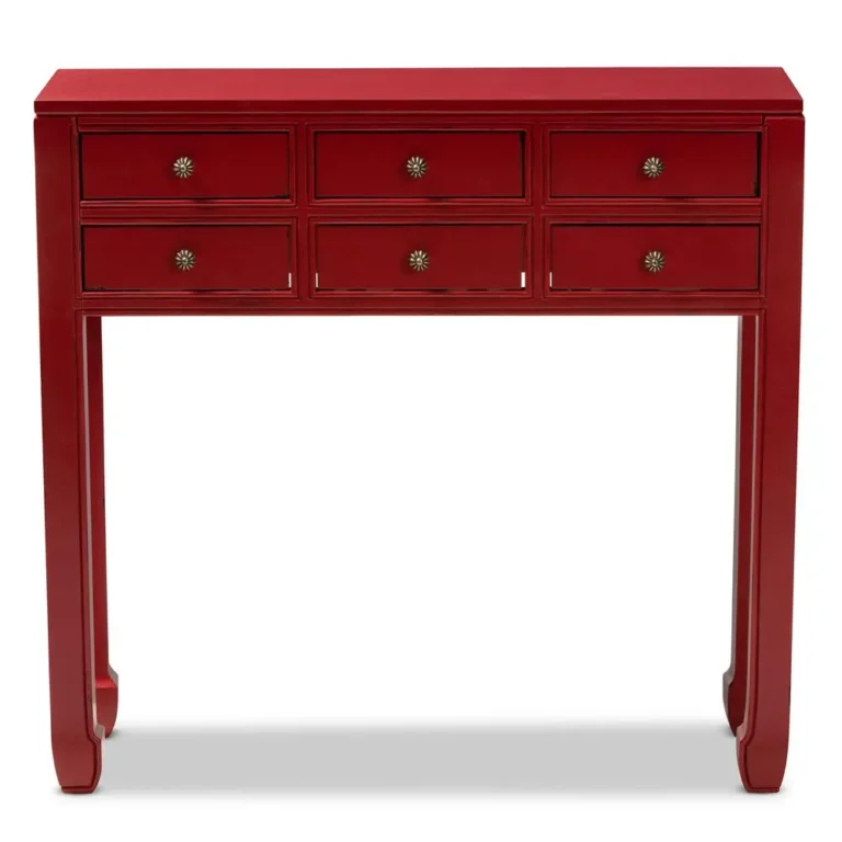 Elegant Antique Red Finished 6-Drawer Console Table with Bronze Accents – Stylish Entryway Storage