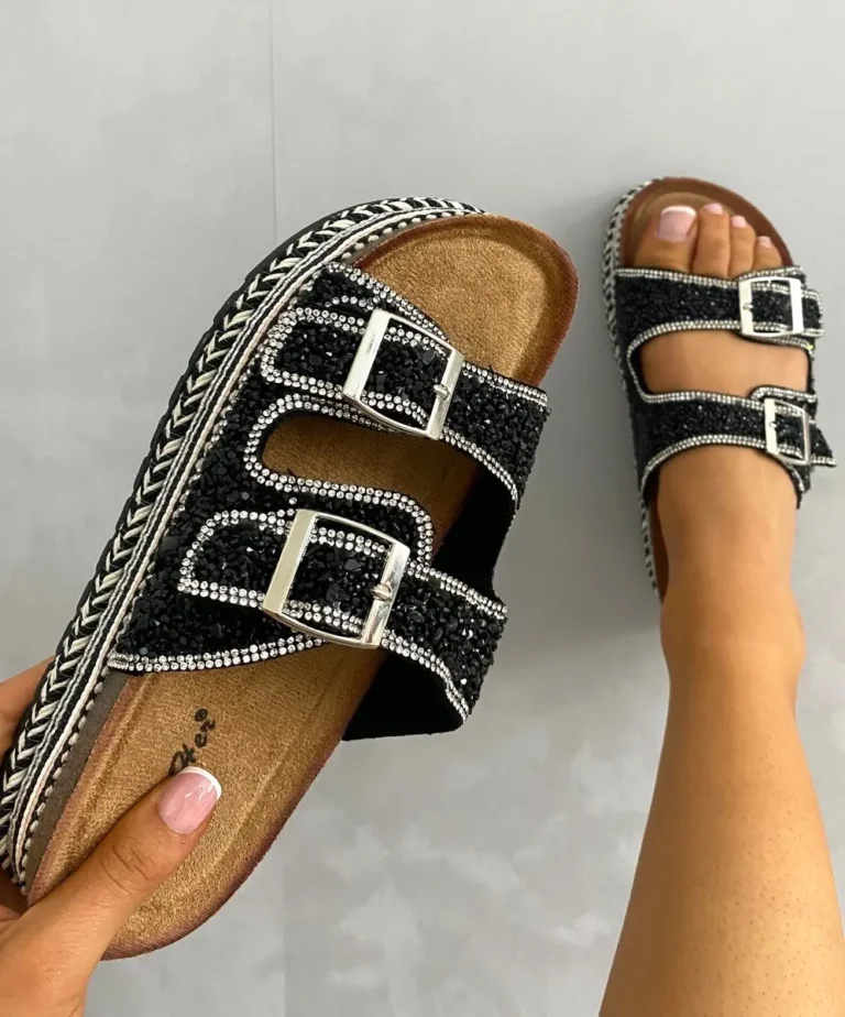Embellished Stone Double Buckle Platform Sandals – Glamour & Comfort for Any Occasion