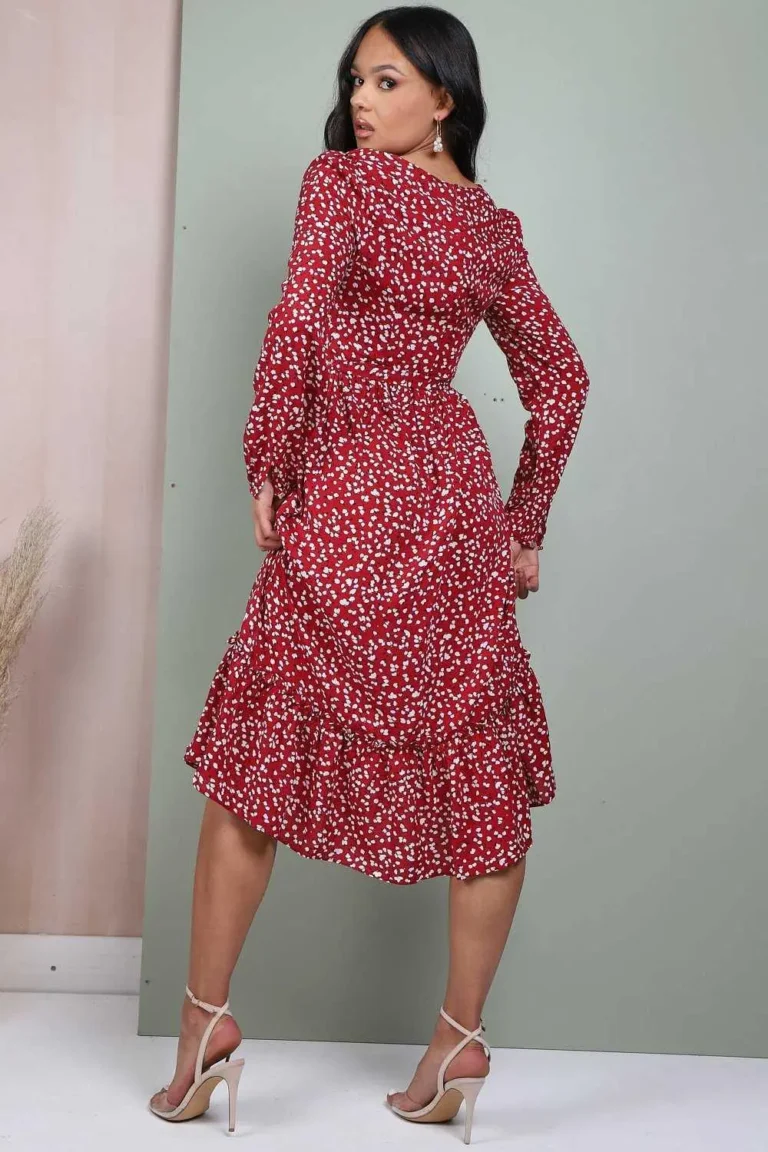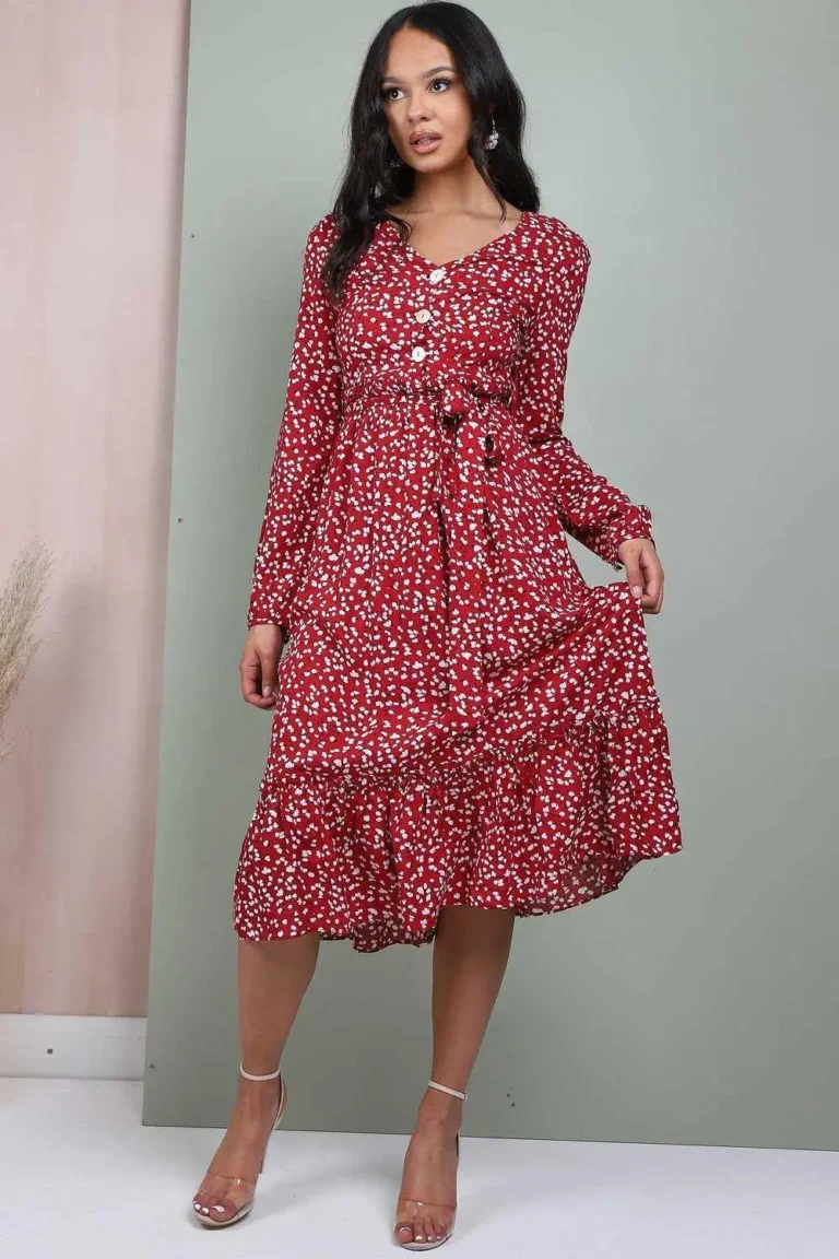 Chic Button Front Belted Midi Dress – Red Floral Print | Versatile & Stylish