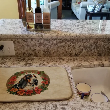 Basset Hound Christmas Dish Drying Mat – Festive Flowers, Absorbent & Non-Slip, 14×22 Inches