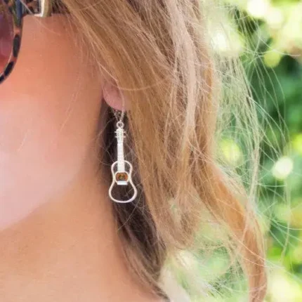 Amber & Silver Guitar Earrings – Handcrafted Sterling Silver with Baltic Amber Gemstone | Unique Music Lovers Jewelry