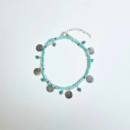 Original price was: USDC19.30.USDC12.87Current price is: USDC12.87.Delicate Discs and Turquoise Beads Anklet – White Gold Plated, 7-inch Stretchable Bracelet & Anklet Combo with Turquoise Charms
