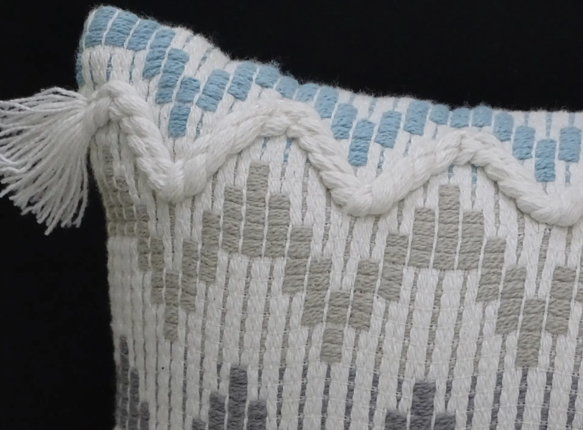 - Design: Chevron pattern with braided details and corner tassels
