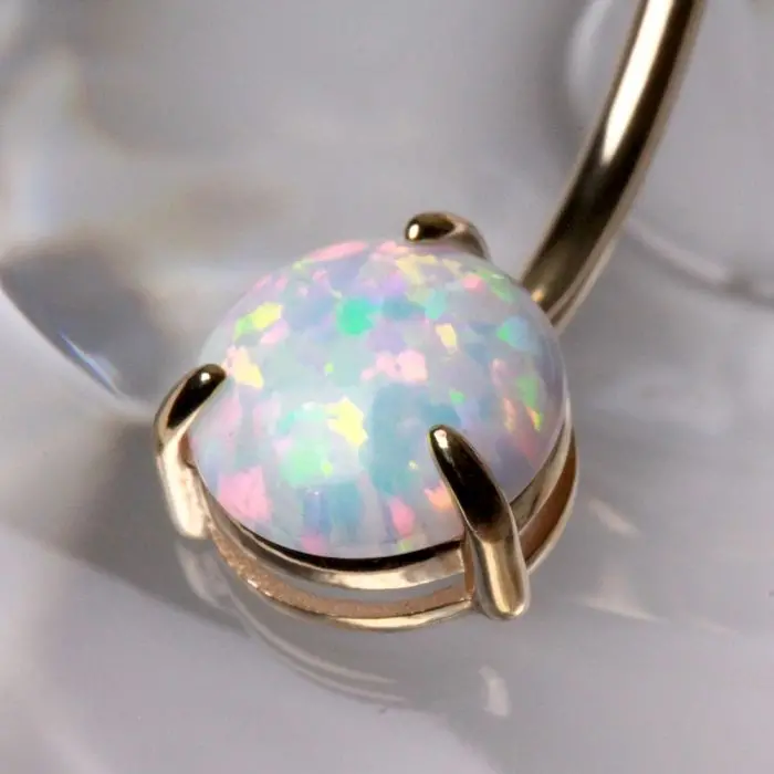 Elegant 14Kt Yellow Gold Navel Ring with Prong Set White Synthetic Opal – Perfect for Stylish Piercings