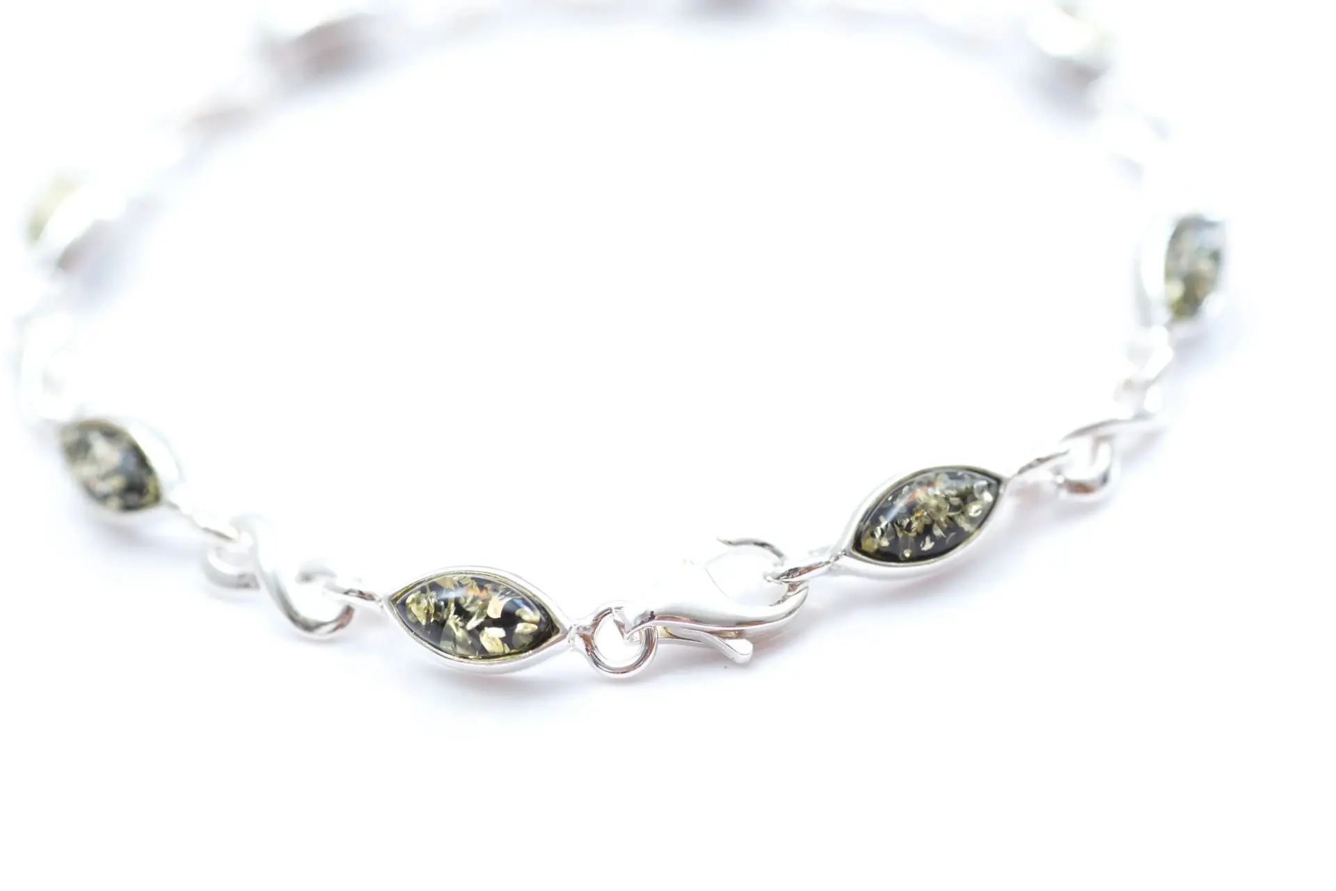 This Green Amber Infinity Bracelet combines the timeless elegance of Baltic amber with the sleek sophistication of sterling silver, making it an ideal gift for a loved one. Each amber piece is meticulously shaped into petite ovals and encased within a sterling silver frame, connected by infinity symbols to represent ‘forever’ or ‘everlasting’.