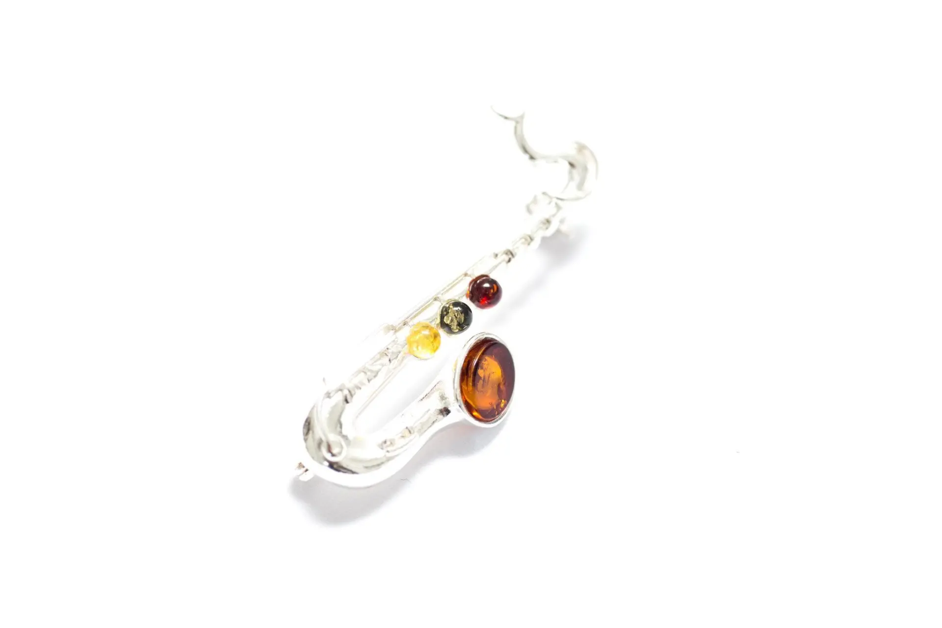 Multi Amber Saxophone Brooch | Sterling Silver & Baltic Amber – Elegant & Unique Jewelry for Music Lovers