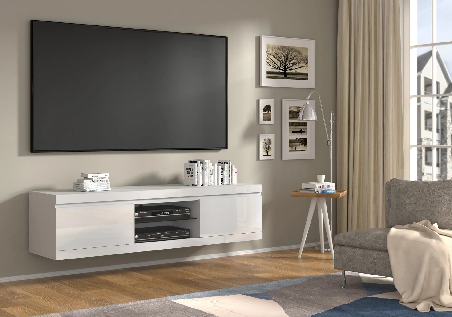 Tags: Cable Management, Entertainment Center, glossy finish, living room decor, modern furniture, storage solutions, TV Stand, versatile TV unit, white TV stand