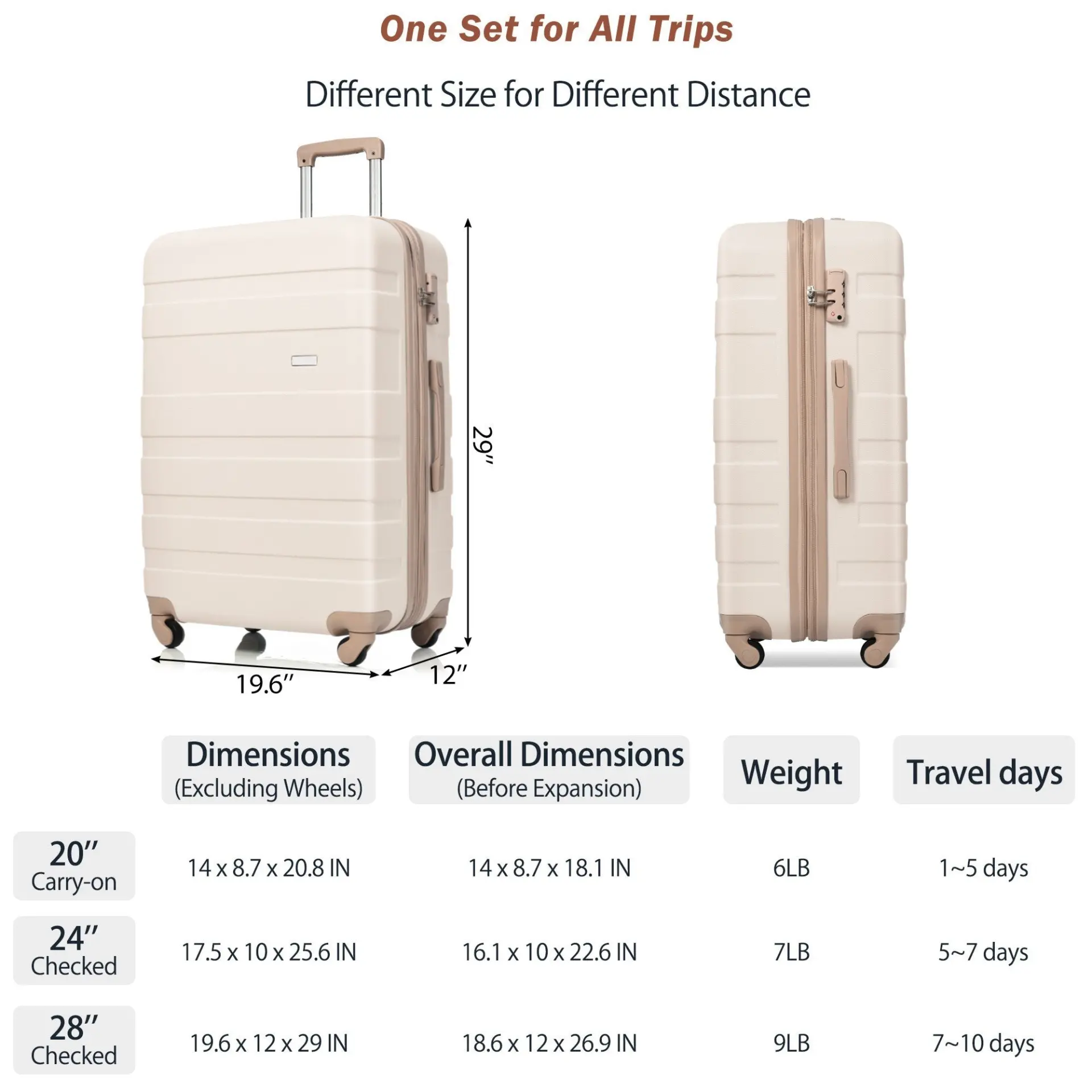 - 3-Piece Set: Includes three expandable suitcases (20”, 24”, 28”), adding 25% more space capacity to accommodate all your travel needs. The 20” size is carry-on friendly, perfect for air travel.