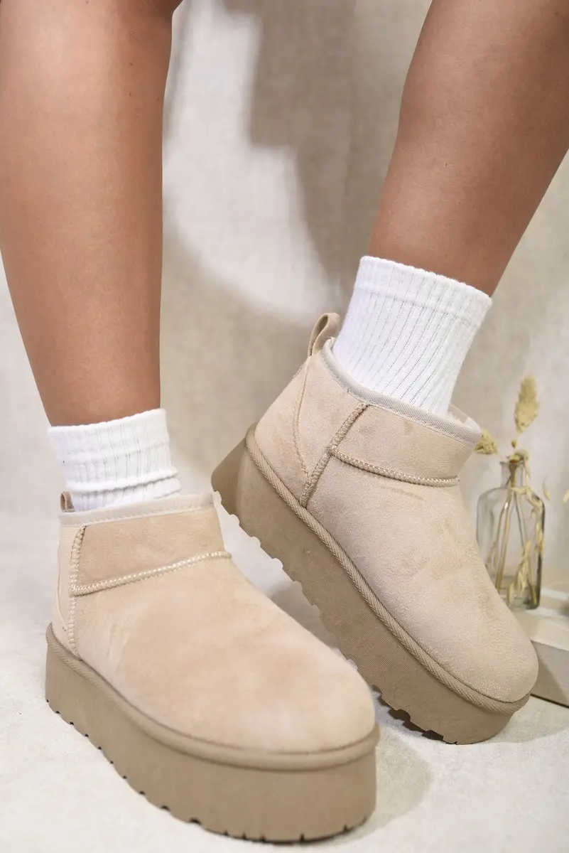 Step into Style with Our Mia Faux Suede Ultra Mini Ankle Platform Boots!