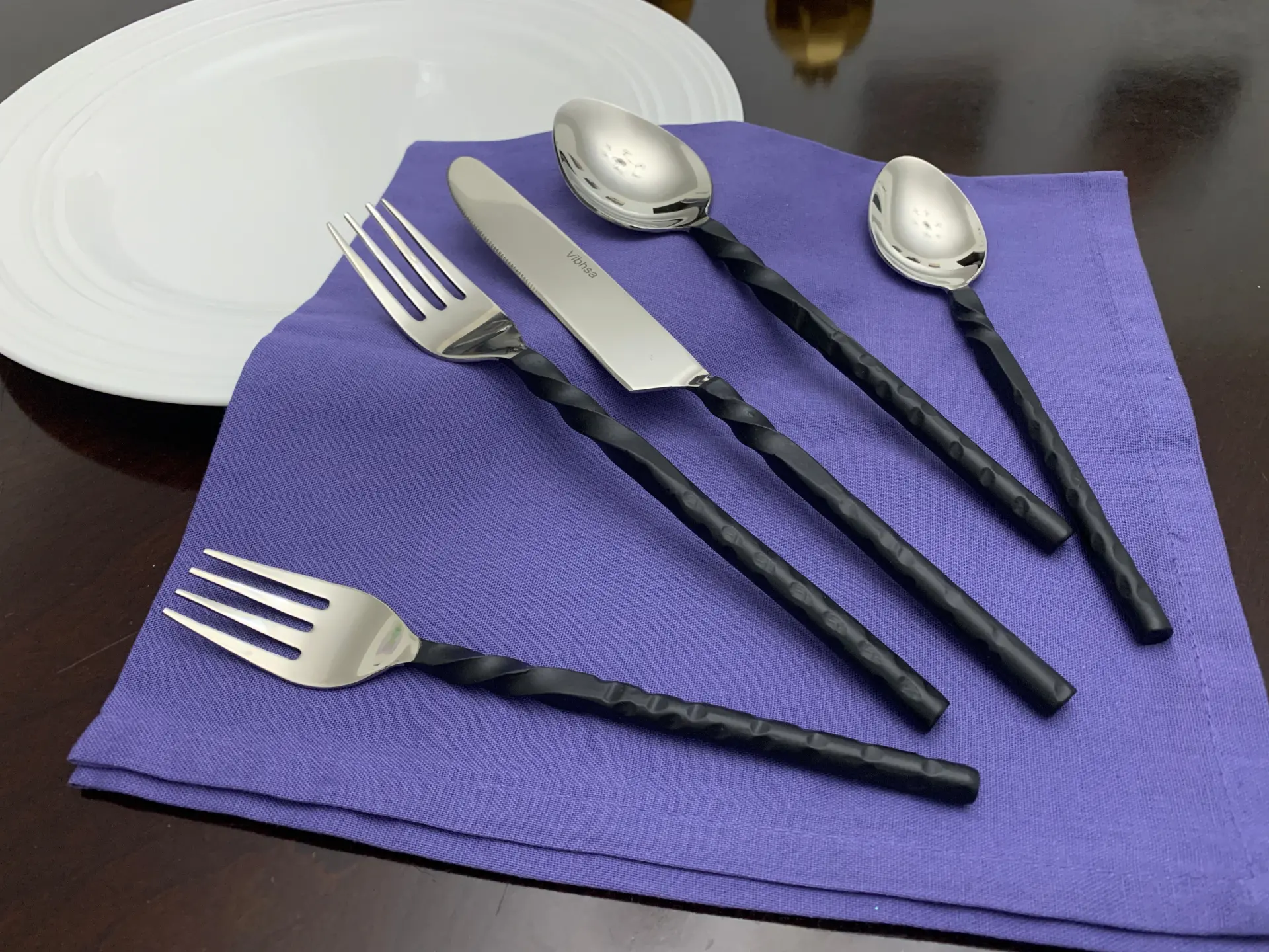 Tags: black swirl handle, dining set, Elegant flatware, flatware set, Formal Dining, gift-worthy flatware, kitchen utensils, stainless steel flatware, Vibhsa flatware