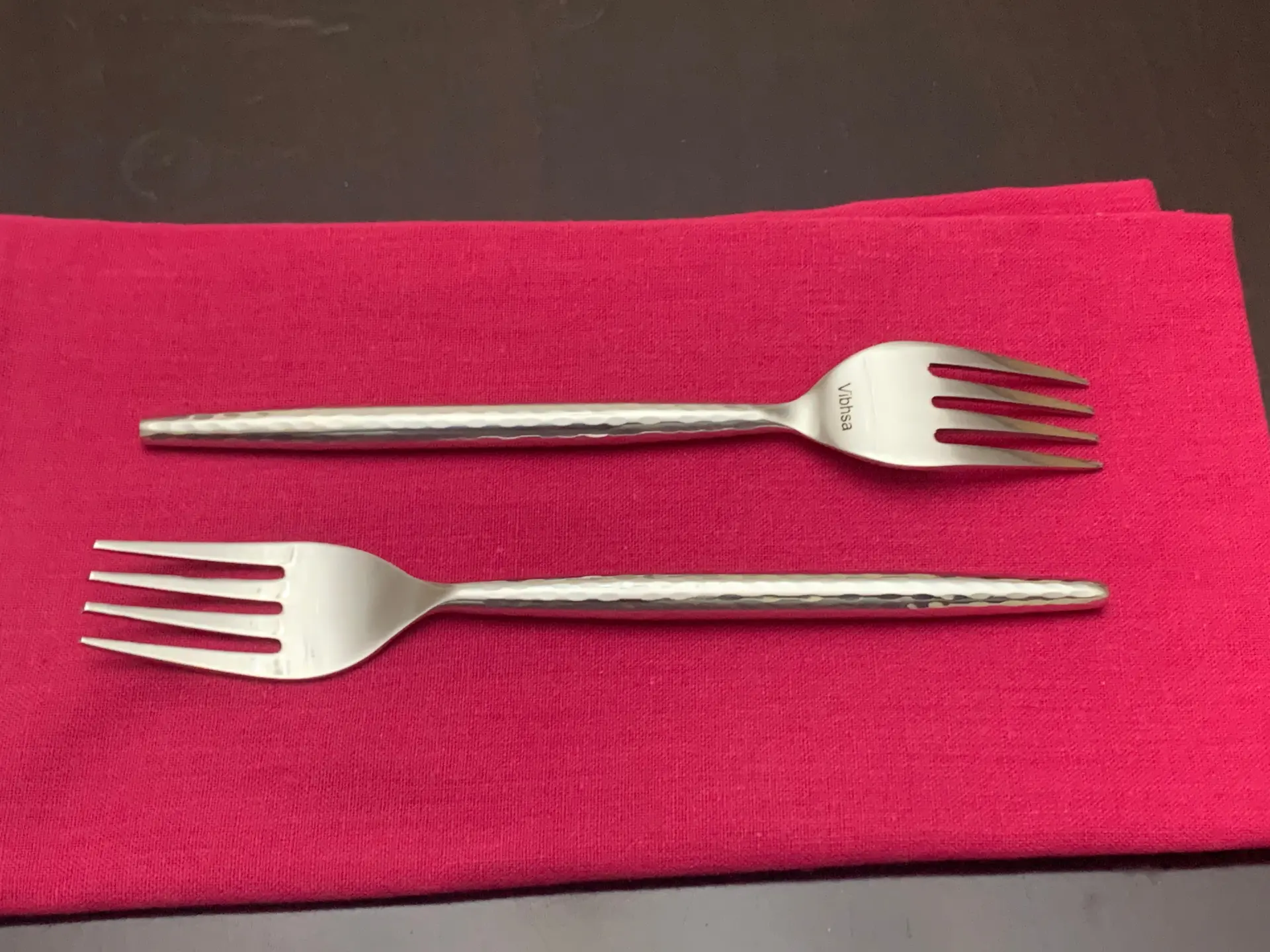 Tags: appetizer forks, dining decor, dishwasher safe, Flatware, gifts, Hammered Design, handmade, Luxurious, salad forks, Special Occasions, Stainless Steel, Vibhsa